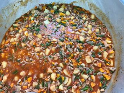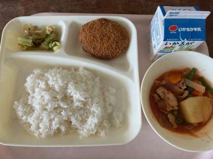今日の献立のケチャップ煮は、豚肉、じゃがいも、たまねぎ、にんじん、トマト缶、さんどまめが入っています。トマトの風味がさわやかな、春を感じる煮ものでした。