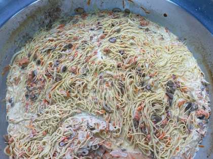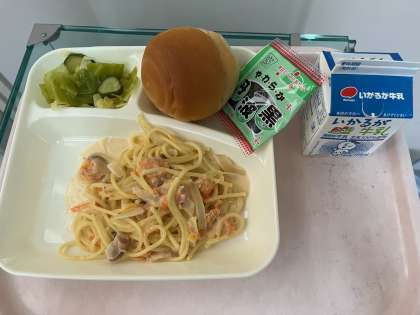 今日の献立のさけのクリームスパゲッティは、紅ざけ(フレーク)を使用し、春らしい淡いピンク色に仕上げています。優しい味で食べやすく、おいしい一品でした。