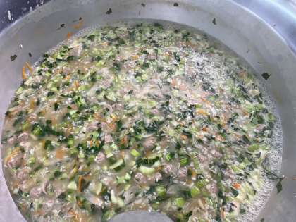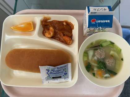 今日の献立の中華がゆは、肉だんご、だいこん、にんじん、しいたけ、チンゲンサイが入ったおかゆです。ごま油の風味がとてもよく、優しい味わいのおいしい一品でした。