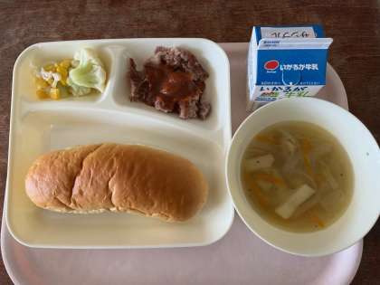 今日の献立の豚肉のデミグラスソースは、豚肉にワイン、塩、こしょう、オリーブ油で下味をつけて焼物機で焼き、りんごピューレ、デミグラスソース、ウスターソース、ケチャップで作ったソースをからませています。ソースにコクがあり、豚肉にとてもよく合うおいしい一品でした。