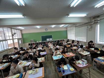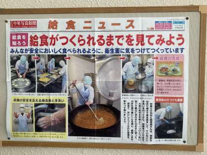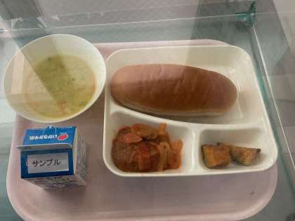 今日の給食は、パン、煮こみハンバーグ、コーンとキャベツのスープ、焼きかぼちゃです。