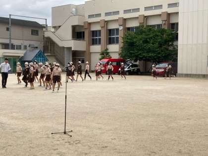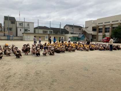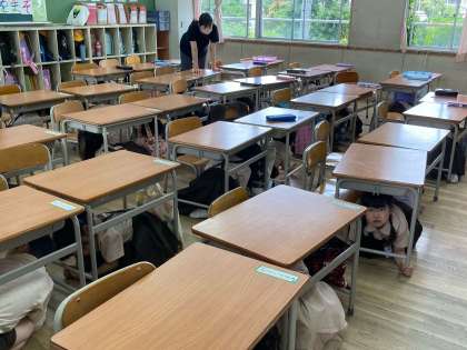 一次避難で机の下に隠れ、自分の身を守ります。今年は3分24秒かかりました。昨年より少しですが、かかってしまいました。