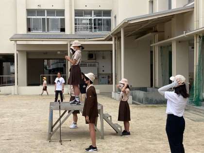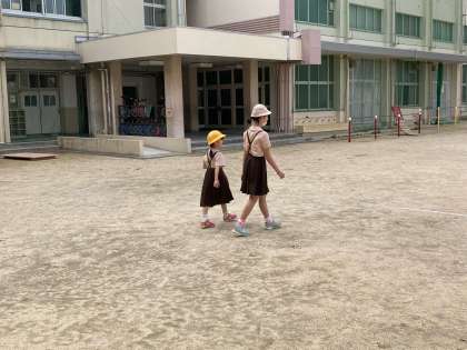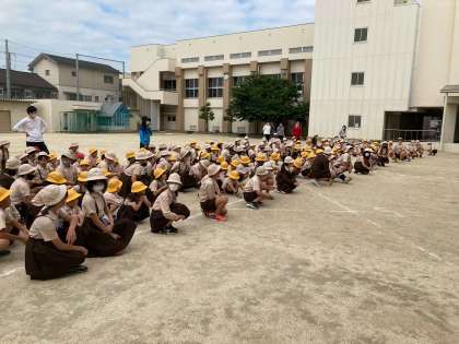 音楽がなりました。集合です。1年生は6年生が引率します。