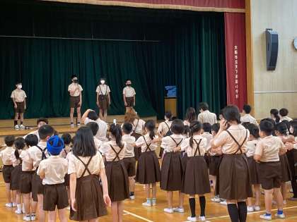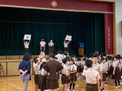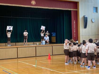 本日は雨のため、体育館で行いました。先生クイズで◯×クイズをしました。盛り上がりました。