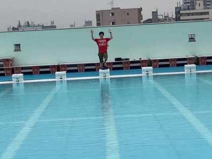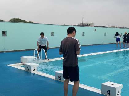 授業の最初が大事です。バディを確認してお互いの体調を確かめます。水温を測り、プールの状態を把握します。準備体操は当然大事です。