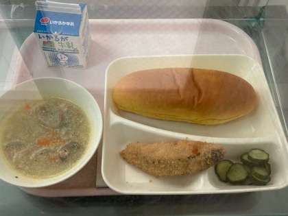 パンプキンパン・サーモンフライ・豆乳スープ・きゅうりのバジル風味サラダ・牛乳です。