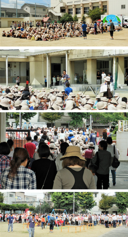 防災学習を終えた児童と保護者の方は、運動場集合ののち、災害時の一次避難場所として「北天下茶屋公園」に集まりました。