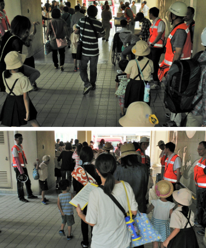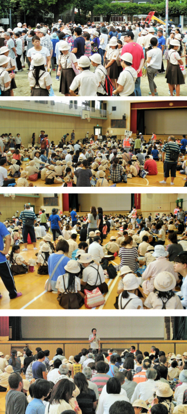 各地域の防災リーダーの方々の指示により、すでに避難訓練で集まっていた地域の皆様と合流しました。