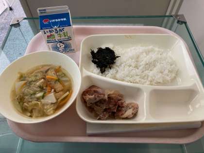 本日の献立は、ごはん・豚肉の甘辛焼き・五目汁・ノリの佃煮・牛乳です。