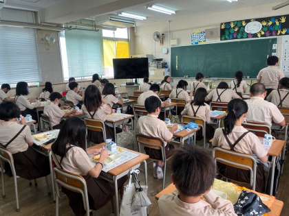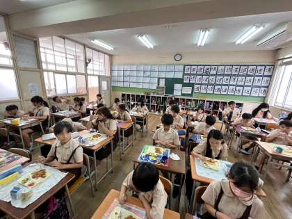本日の給食の様子は、高学年5年生と6年生です。さすがに準備も早く手際よく配膳していました。「もぐもぐ」食べて下さいね。