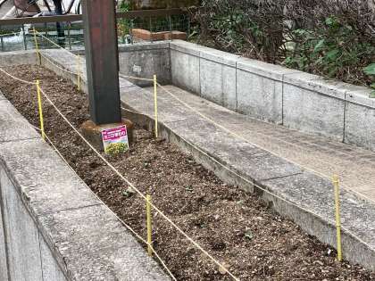 管理作業員さんが、玄関に「ミニひまわり」を植えてくれました。楽しみですね。