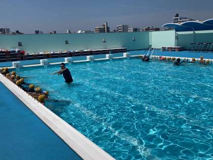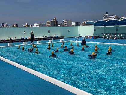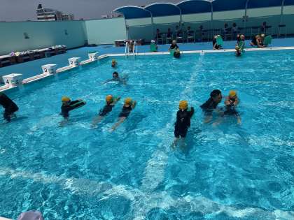 今年一番の暑さの中、水泳頑張っています。4年、2年、1年生です。