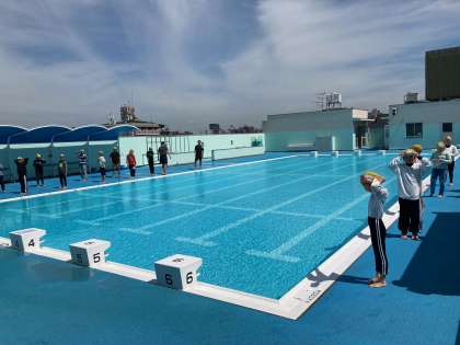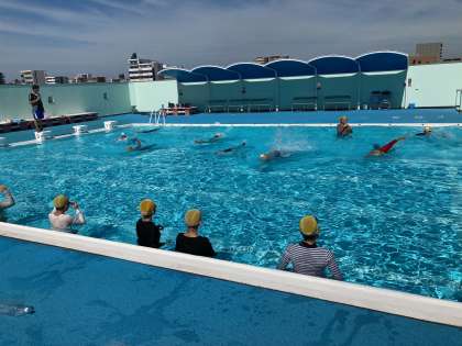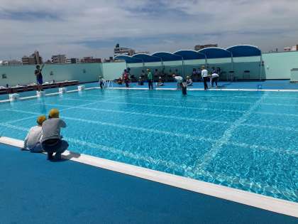 災害など服のまま水の中に入った場合などの対応の練習です。今年最後のプール水泳です。