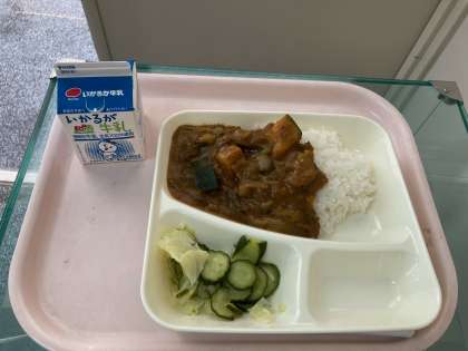 今日の献立は、夏野菜のカレーライス、キャベツときゅうりのサラダ、みかんゼリー、牛乳です。