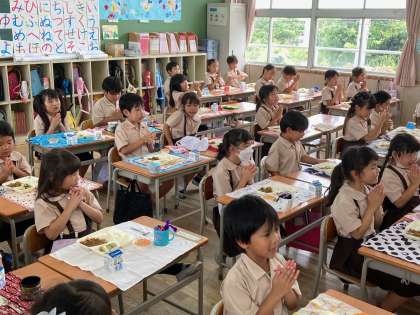 1学期最後の給食は、子どもたちには人気の定番「カレーライス」です。しっかり食べてくださいね。