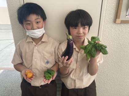 給食委員会で育てた夏野菜を調理員さんにプレゼントしました。