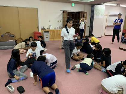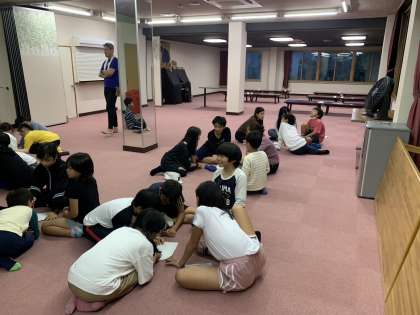 キャンプファイヤーに変更すると連絡しましたが、雨の為宿舎でレクリエーションをしています。