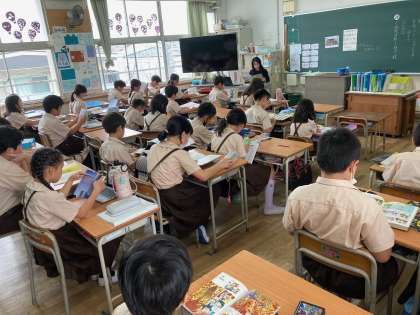 8:30に図書委員会の放送により10分間の「読書タイム」が始まります。図書委員も放送室で読書します。朝の読書は心を落ち着かせ、学習の効果をあげます。木曜日には学校司書の勤務日になっており「図書」の時間ということで1時間図書室を使って読書活動を行っています。