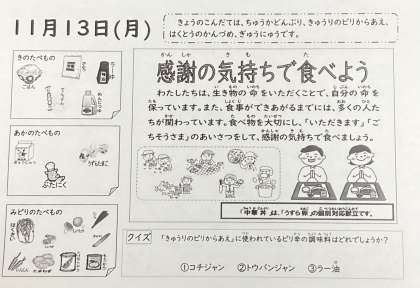 そしてこの日を記念して「学校給食感謝の日」と定め、その後の冬休みに重ならない1月24日から30日を「全国学校給食週間」としました。