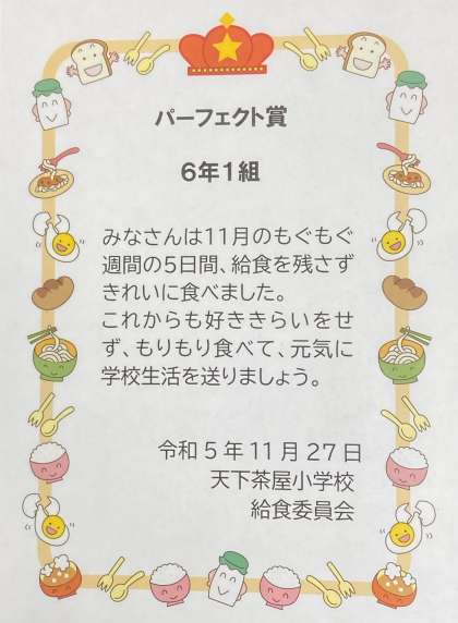 13日から17日に行いました残食調べで、残食が0だったクラスの表彰を行いました。表彰クラスは、3年1組、3年2組、5年、6年生です。