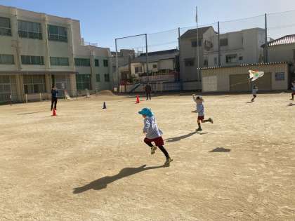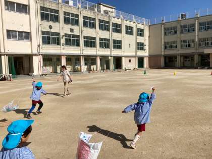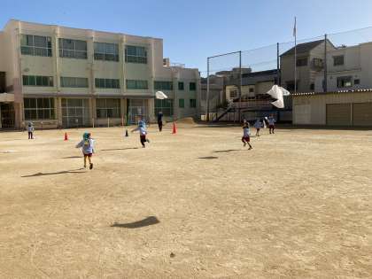 天下茶屋幼稚園の園児が、小学校で凧揚げをしました。