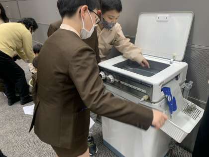 昔の洗濯機とアイロンの使い方を学んでいます。