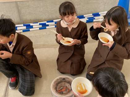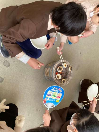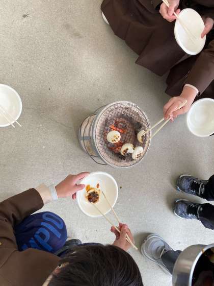 お餅を焼いて、膨れたら醤油をつけて食べます。「美味しい?」