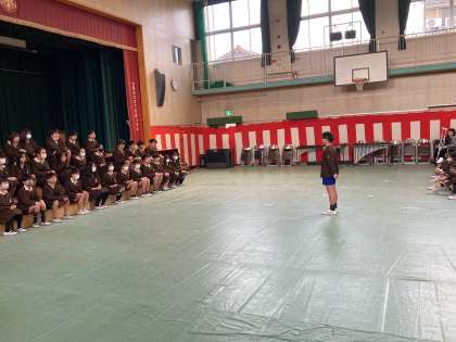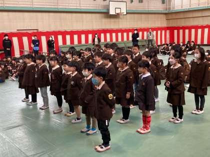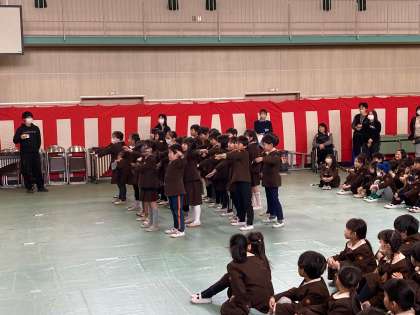 各学年からお祝いの歌や演技を披露しました。1年生と2年生です。