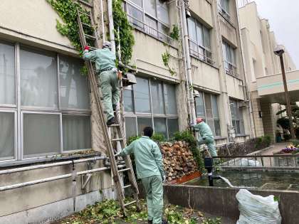 近隣の学校から応援に来て頂いて、校舎に巻きついた樹木を剪定してくれました。「ありがとうございます」