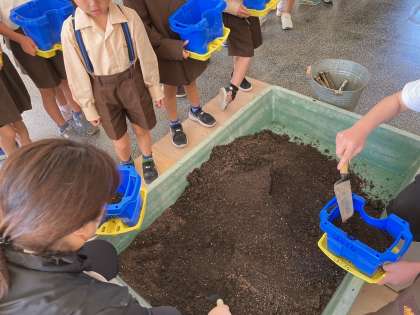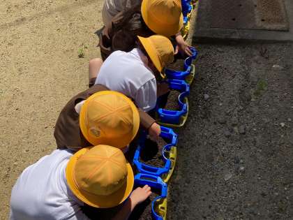 朝顔の種を植えます。終業式に家へ持って帰ります。