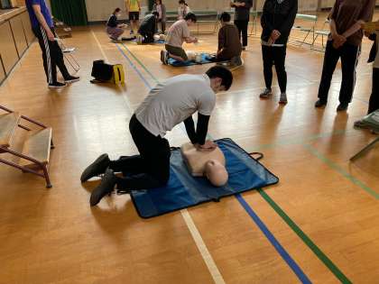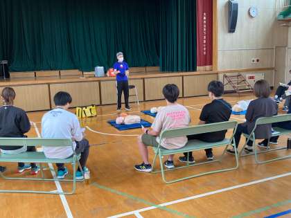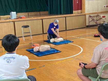 運動会やプールの授業の前に、講習を行いました。AEDの使い方などを確認しました。
