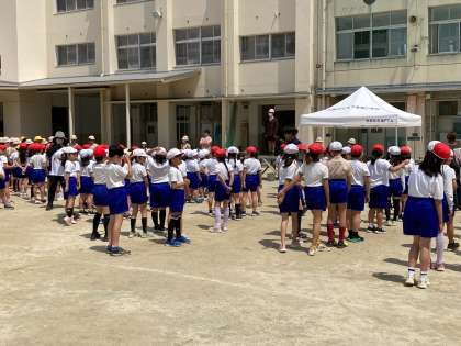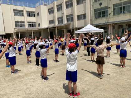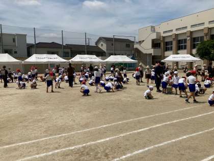 運動会の練習を効果的に行う為、15分休みにラジオ体操をします。合わせて、安全の為に石を拾っておきます。