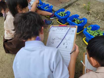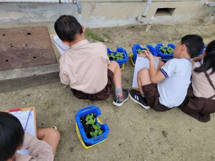 茎の色によって花の色が違うことを知り、みんなで色や形の観察をしました。
