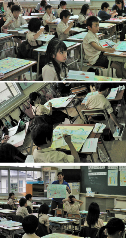 「スイミーの海の世界を描こう」という題材で、使い慣れない絵の具での彩色・表現を学びました。パレットの使い方や水加減など、しっかりとお話説明を聞き、楽しい「海の世界」を表現していました。