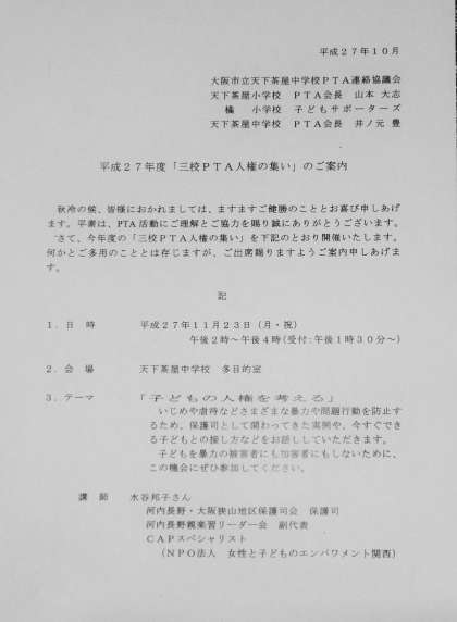 天下茶屋中学校、橘小学校、天下茶屋小学校による「三校PTA人権の集い」が、11月23日(月)午後2時より、天下茶屋中学校 多目的室で開催されます。