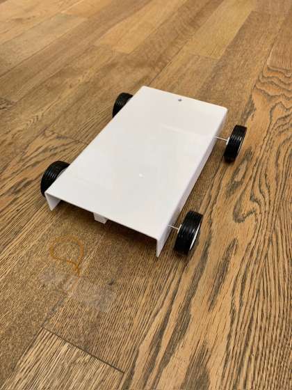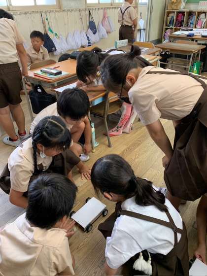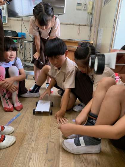 わゴムをのばす長さを5cm、10cm、15cmのときと変えると、車が動いたきょりはどうなるのかの実験をしています。