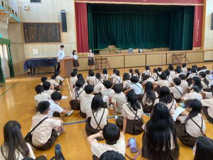 「今日はおまつりをしましたが、学校でするのでちゃんと勉強です。お店を決めるのにみんなで話し合いました。知恵を出しあったり工夫したりしました。お店をするのにみんなで協力しました。今日は縦割りの班で活動しました。6年生がリーダーでみんなをひっぱりました。みんなが役割を決めてその役割を一生懸命頑張りました。すべて勉強です。