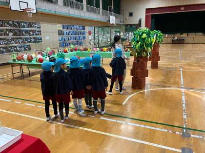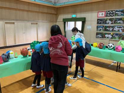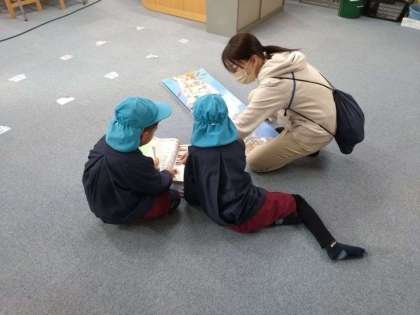 天下茶屋幼稚園の園児が、作品展の見学と図書室で本を読みました。
