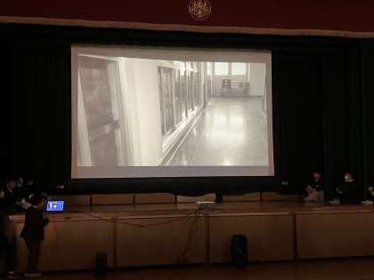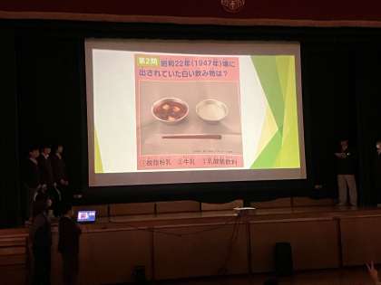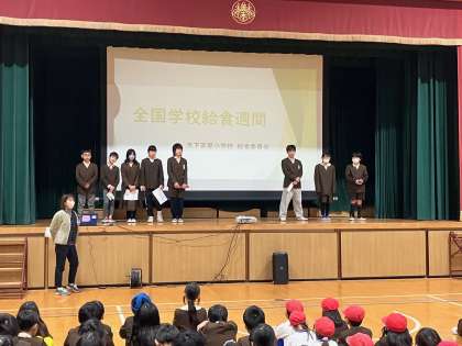 給食週間で給食委員会による集会をしました。給食にまつわるクイズや毎日美味しい給食を作ってくれる調理員さんに感謝のビデオレターもありました。