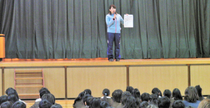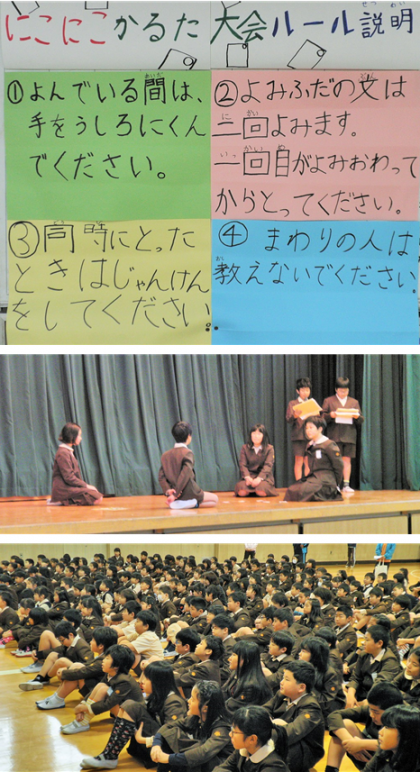 給食委員会からの報告の後、代表委員による「にこにこかるた大会」の説明がありました。