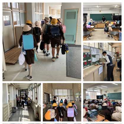 台風接近の避難訓練を実施しました。縦割りのなかよし班ごとに集まって、班で帰ります。