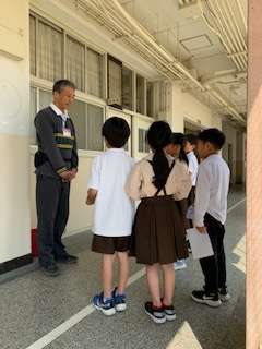 理科室の先生に、「理科室は何をする所ですか?」「理科のお勉強は、楽しいですか?」と質問をしています。