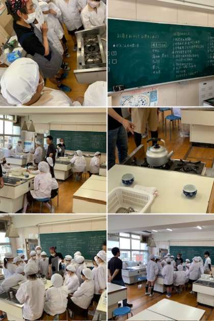 お茶の淹れ方を学んでいます。調理実習では、火傷に気をつけて、ガスのコンロの使い方から始めます。