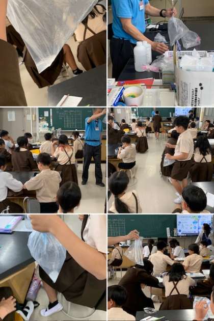吸った後の空気を袋に詰めて、石灰水を入れて振ると白く濁りました。
