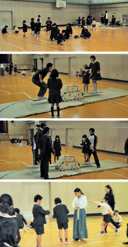 今日は、体育館で日本の昔遊びや世界の遊びをしました。