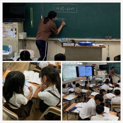 2年生算数科「時こくと時間」で一時間=60分で考える学習です。友だちと教え合ったり、学び合ったりする様子が見られます。