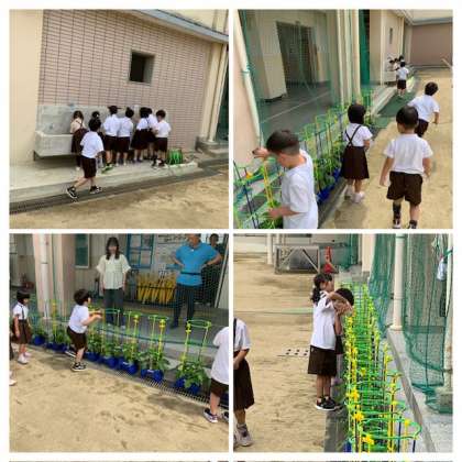 休み時間になると、自分の朝顔に水をあげます。「大きくなぁれ」と声をかけてあげるともっと大きくなるよと伝えると1年生の子どもたちは素直に声をかけながら水やりをしています。