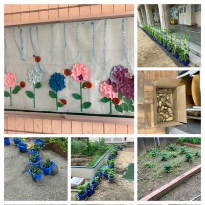 梅雨でスッキリしない日もありますが、朝顔やトマト、ジャガイモは順調に成長しています。