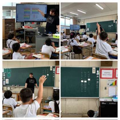 「のばして読む音」の学習です。あいうえお表から気づくことは、ありますか??という先生の問いかけから手が挙がります。