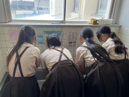今週は「手洗い週間」です。手洗いの歌を放送し、手洗いしているところです。